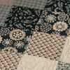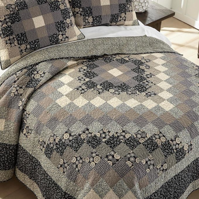 The Lexington Trip Quilt Set features a classic trip-around-the-world pattern composed of small, evenly sized square patches arranged in concentric color waves. The color palette blends warm neutrals, soft taupe, beige, olive, and black, with a mix of floral, checkered, and textured prints adding visual depth.